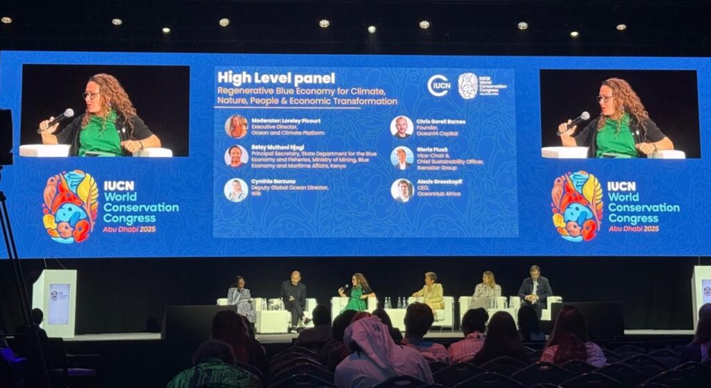 Next up was the IUCN World Conservation Congress, held in October in Abu Dhabi, United Arab Emirates. This event only happens every four years, and is a key global forum for experts in nature conservation. Over 10,000 individuals participated this year, including OLs Loreley Picourt and Alexis Grosskopf, who – amongst other activities – shared the stage as panel members for a session on Regenerative Blue Economy. Also in attendance was Willys Osore, who had a particularly special stage appearance.